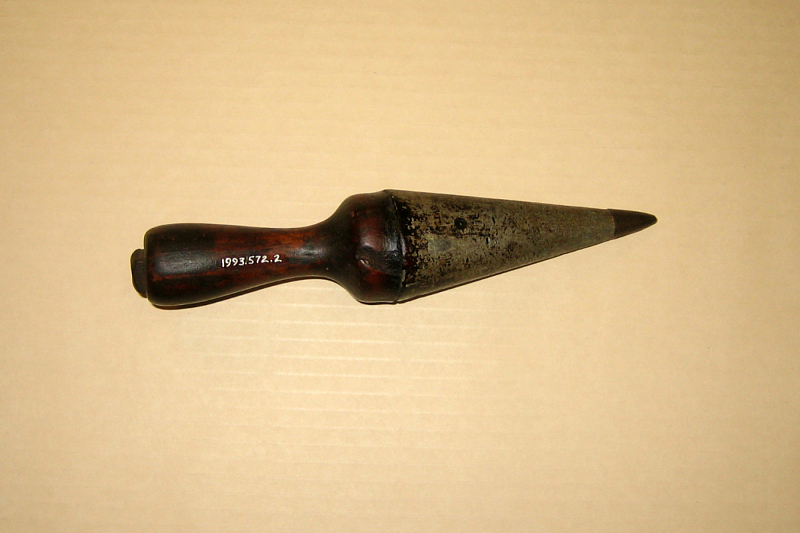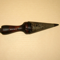 An ice cream cone mandrel, ca. 1920s, from Doumar Ice Cream. One story behind the ice cream cone was that Abraham Doumar and Ernest A. Hamwi collaborated during the 1904 World's Fair to stuff a Persian waffle with ice cream. Afterwards Doumar continued the idea, shaping thin waffles into cones and selling them on the East Coast. The Doumar family donated this metal-tipped mandrel to the Smithsonian in the 1990s. Using the tip, the cone maker lifts the thin, browned waffle off the waffle plate and wraps it around the mandrel to make the classic cone shape.