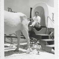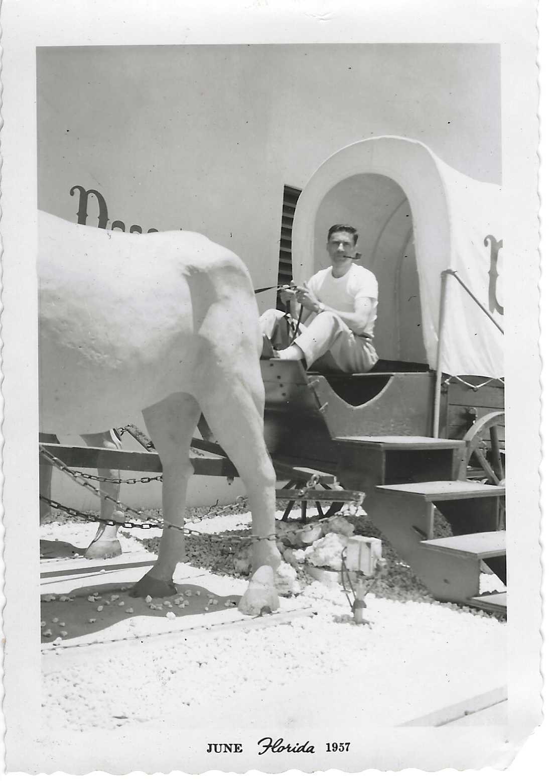 - Salvatore Guzzo Jr. sits atop a fake wagon outside of the Desert Inn, smoking a pipe.