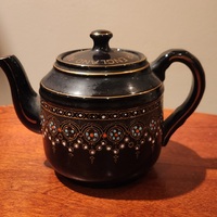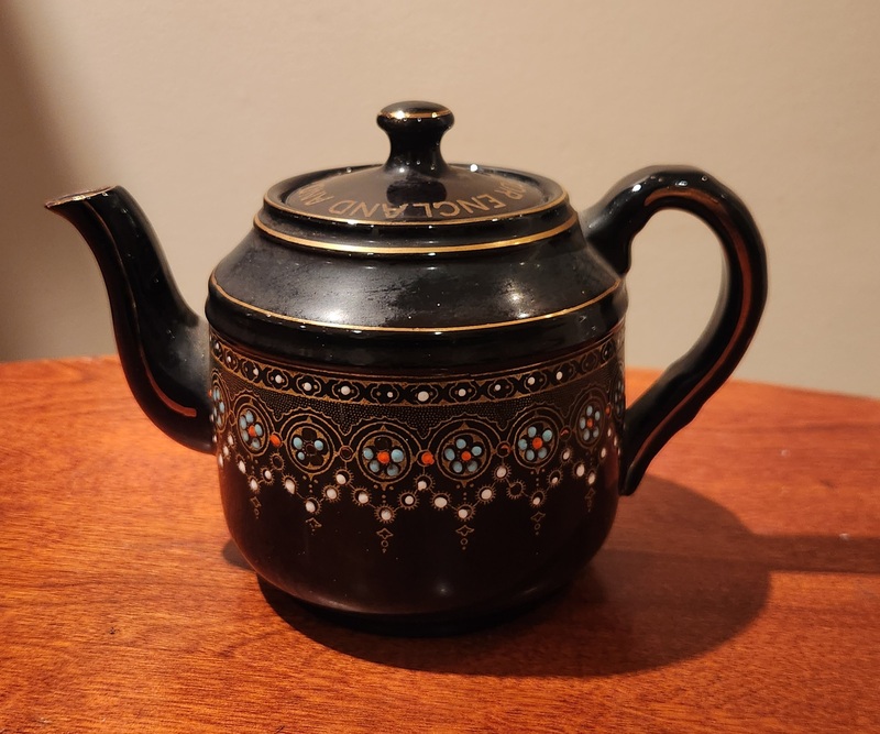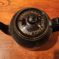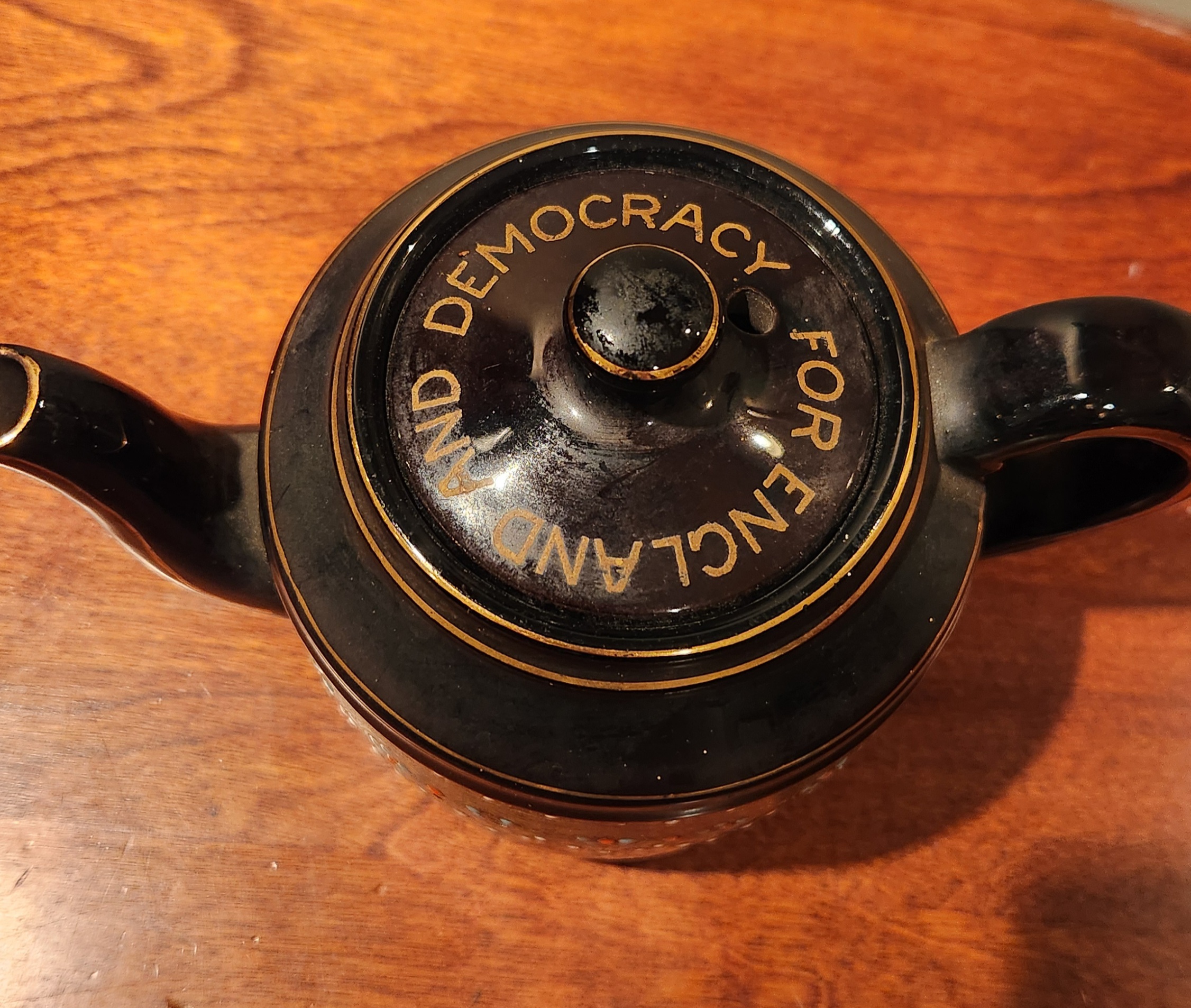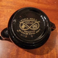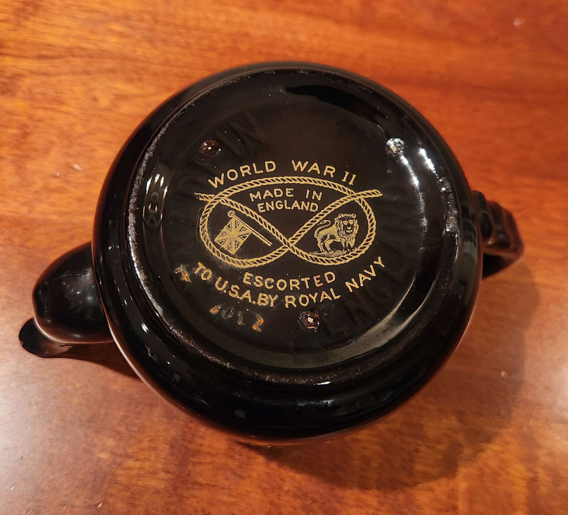 This teapot was created during WWII by England. It was shipped to and sold in the United States as a fundraising effort. The lid is inscribed with the phrase "FOR ENGLAND AND DEMOCRACY", and the bottom is stamped with "WORLD WAR II MADE IN ENGLAND ESCORTED TO U.S.A. BY ROYAL NAVY".