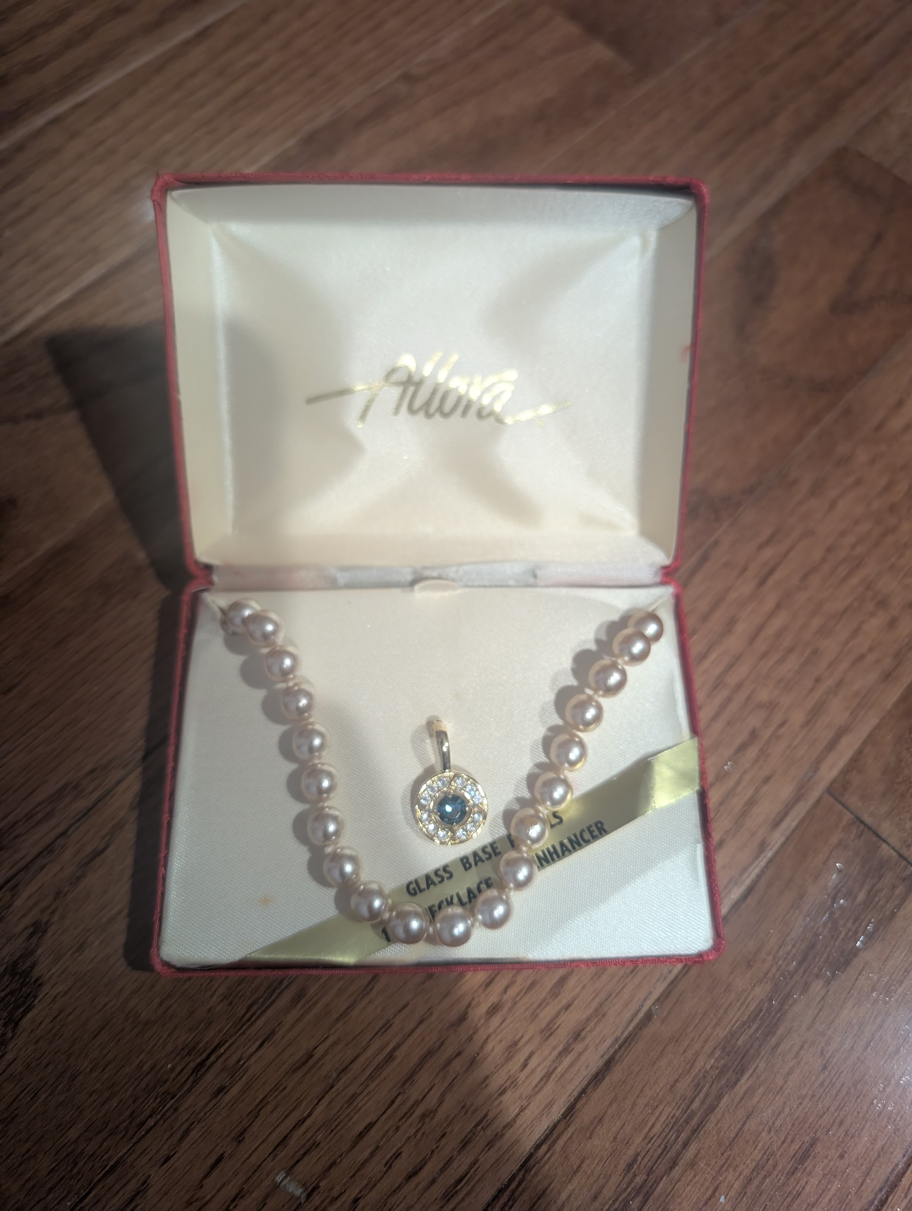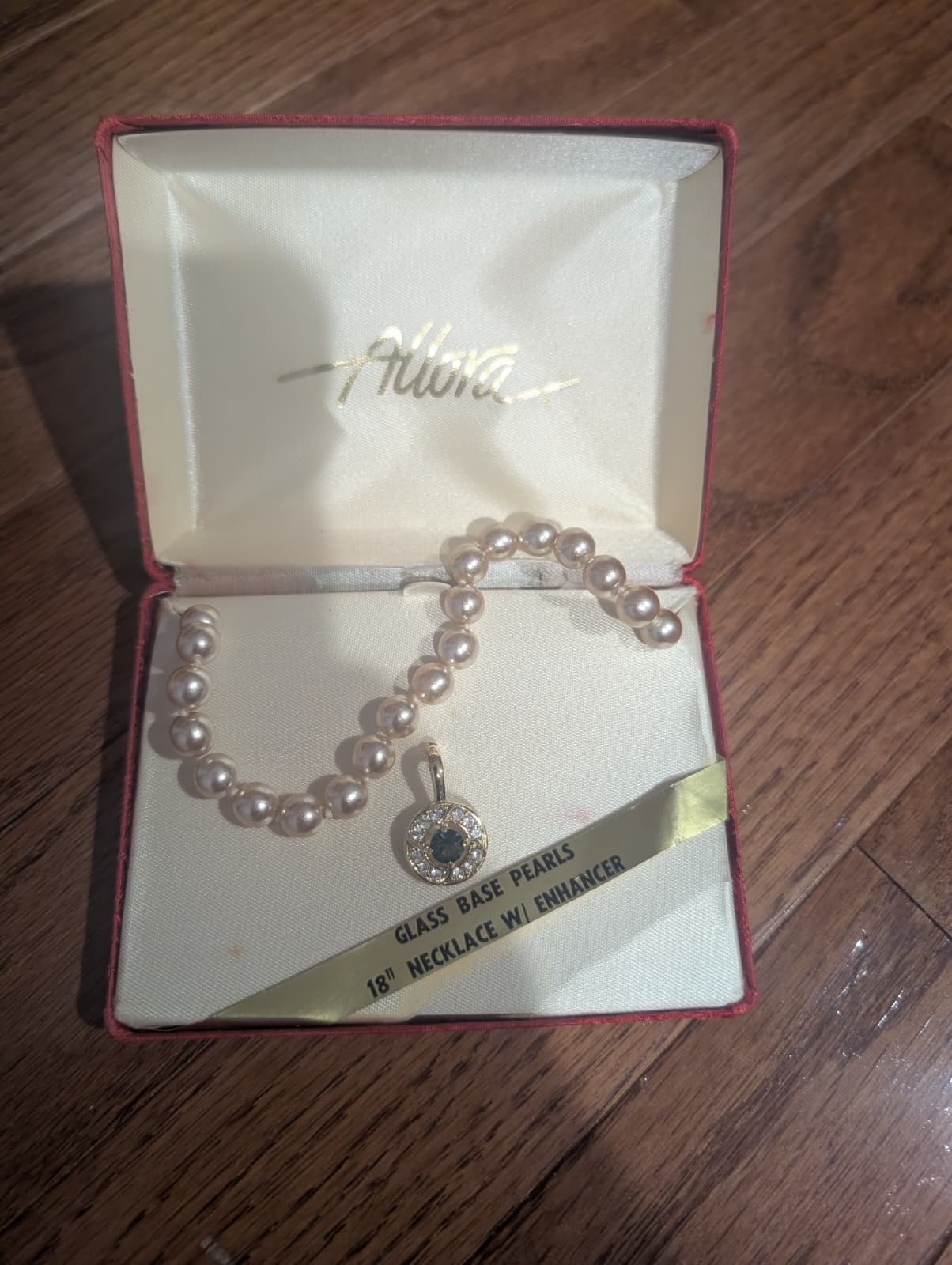 - An 18 inch glass-pearl necklace with an enhancer. It was gifted to Beulah McAndrew by her favorite son, Vincent, upon his return from the Pacific Theater of World War II.