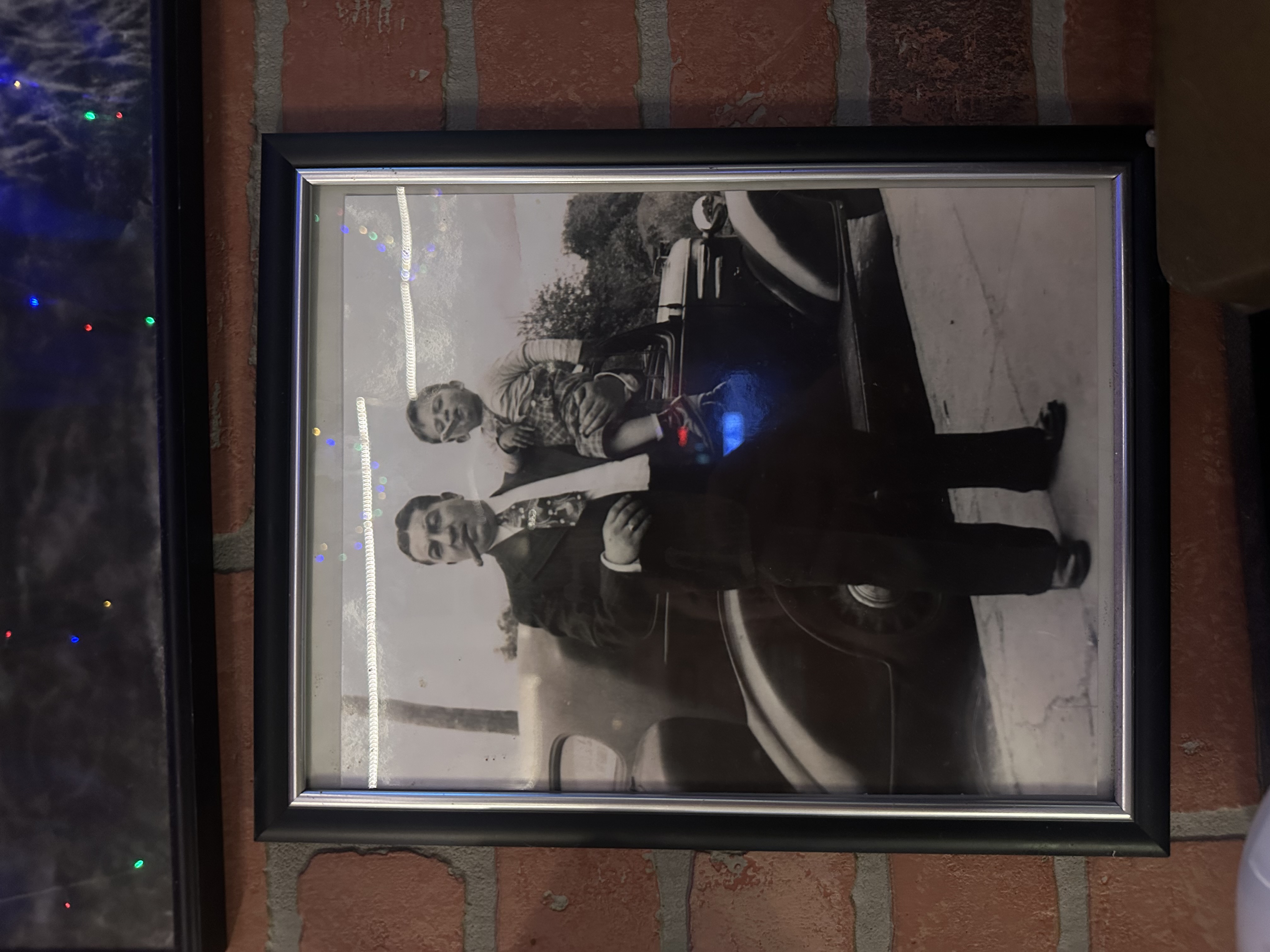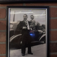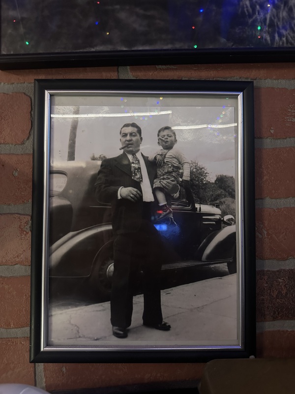 This black and white photograph shows a father-son duo posed in front of a car. The father, Charlie 'Blood' Benanti, whose on the left, stands in a well tailored suit. Charlie holds his son, Salvatore 'Coach' Benanti, in his left arm. Salvatore appears to be 3-4 years old at the time of the photograph. The pair each hold a cigar in their mouths, while staring straight at the camera.