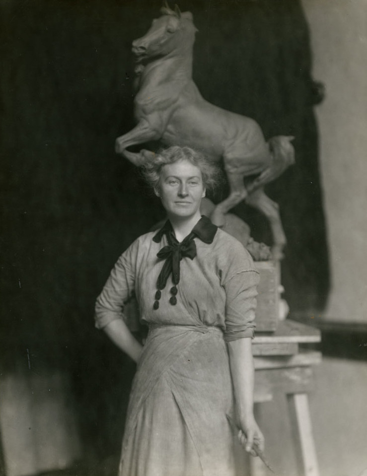 Anna Vaughn Hyatt Huntington was a popular American sculptor in the early 1900s. She was known for her realistic sculptures of animals. Growing up, Anna's father Alpheus was a professor of paleontology and zoology at Harvard University. He inspired Anna’s interest in animals at a young age. Anna first worked with sculptor Henry Hudson Kitson while in Boston, however, he kicked her out when she critiqued his work. Next, she was taught by Hermon Atkins MacNeil and Gutzon Borglum while attending the Art Student League of New York. Anna left school to independently study where she often would visit the Bronx Zoo. She met and collaborated with sculptor Abastenia St. Leger Eberle until moving to Europe in 1907. She continued to independently study in Europe in Auvers-sur Oise. She was fascinated by horses which were often the subject of her sculptures. Huntington is known for her life-size, realistic depictions of horses. Anna’s art was entered into a competition at the 1928 Summer Olympics. Anna was one of the first woman artists to be elected to the American Academy of Arts and Letters. With her career at its peak, she married her husband Archer Milton Huntington in 1923. The couple bought Brookgreen Gardens in South Carolina in 1930. The property first acted as a personal home for Anna while she battled Tuberculosis. Anna contracted tuberculosis in 1927. She battled the disease for a decade and survived. Eventually, the Brookgreen Gardens were opened to the public to display over 300 hundred sculptures. During the Great Depression, the Gardens supported struggling sculptors by commissioning pieces. The present-day gardens hold over 900 sculptures. Anna was a member of the National Academy of Design and the National Sculpture Society. Anna and Archer were large benefactors to the organizations. The couple founded 14 museums and wildlife preserves. Huntington’s work is held in museums such as the Metropolitan Museum of Art, the National Academy of Design, the New York Historical Society, the Hispanic Society of America, and Columbia University. One of her most famous sculptures was Joan of Arc which is located in Manhattan, New York.
