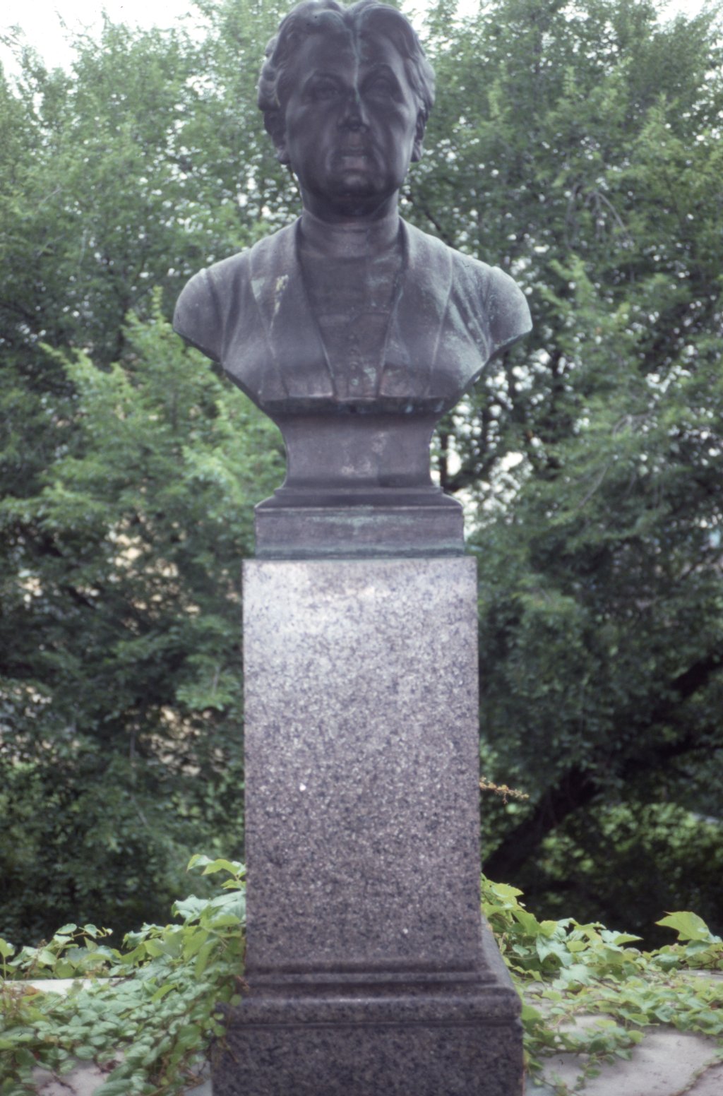The bust is made of bronze and sits on a tall cement pedestal. It is housed in an open-air colonnade.