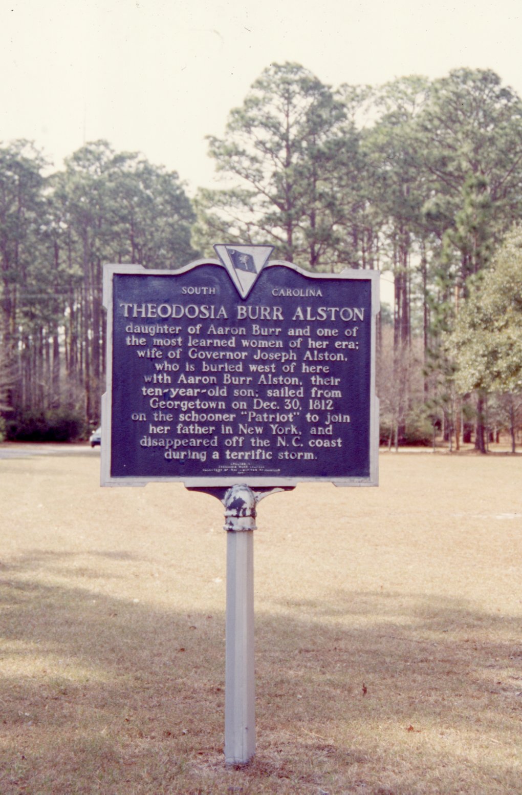 daughter of Aaron Burr and one of the most learned women of her era; wife of Governor Joseph Alston who is buried west of here with Aaron Burr Alston, their ten-year-old son; sailed from Georgetown on Dec. 30, 1812, on the schooner “Patriot” to join her father in New York, and disappeared off the N.C. coast during a terrific storm.