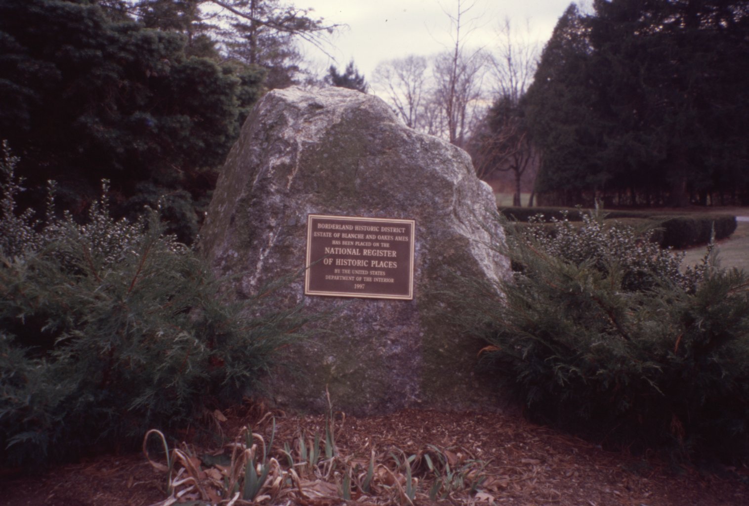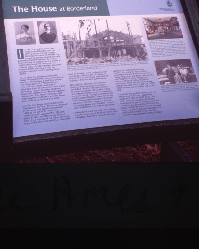 In 1971, following Ames’ death, the Commonwealth of Massachusetts acquired the property and it became a state park. The Ames family also donated most of the contents of the mansion to the state. In 1997, the Borderland Historic District was placed on the National Register of Historic Places by the US Department of the Interior. Today, the park is accessible to the public and has a variety of hiking and mountain biking trails, alongside ponds which can be used for fishing and non-motorized boating. - Text