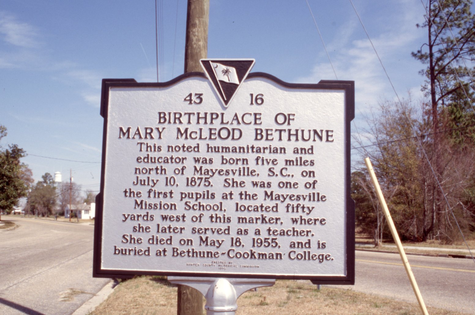 This noted humanitarian and educator was born five miles north of Mayesville, S.C. on July 10, 1875. She was one of the first pupils at the Mayesville Mission School, located fifty yards west of this marker, where she later served as a teacher. She died May 18, 1955, and is buried at Bethune-Cookman College. - Date Created
