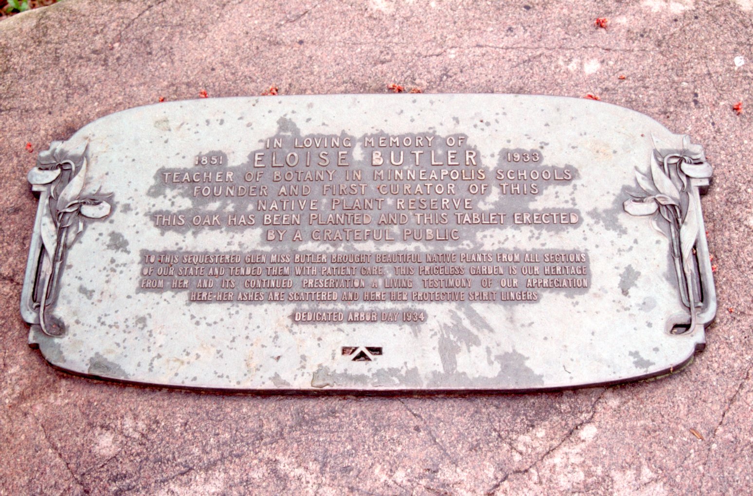 This memorial tablet is located in the Eloise Butler Wildflower Garden and Bird Sanctuary. The tablet was dedicated on May 4, 1934, the year after Butler’s death. Butler’s friends and former pupils worked to raise money for the tablet. Butler’s ashes were sprinkled on the site of this memorial.